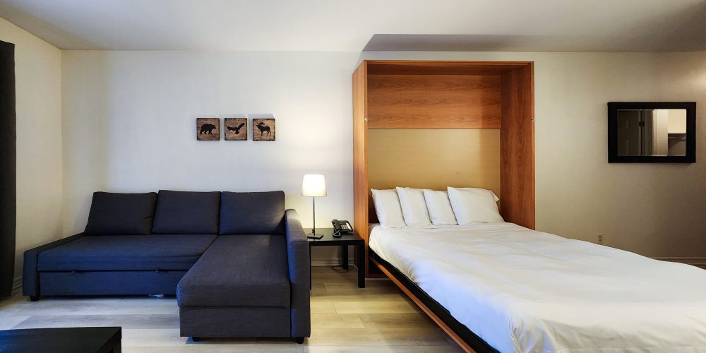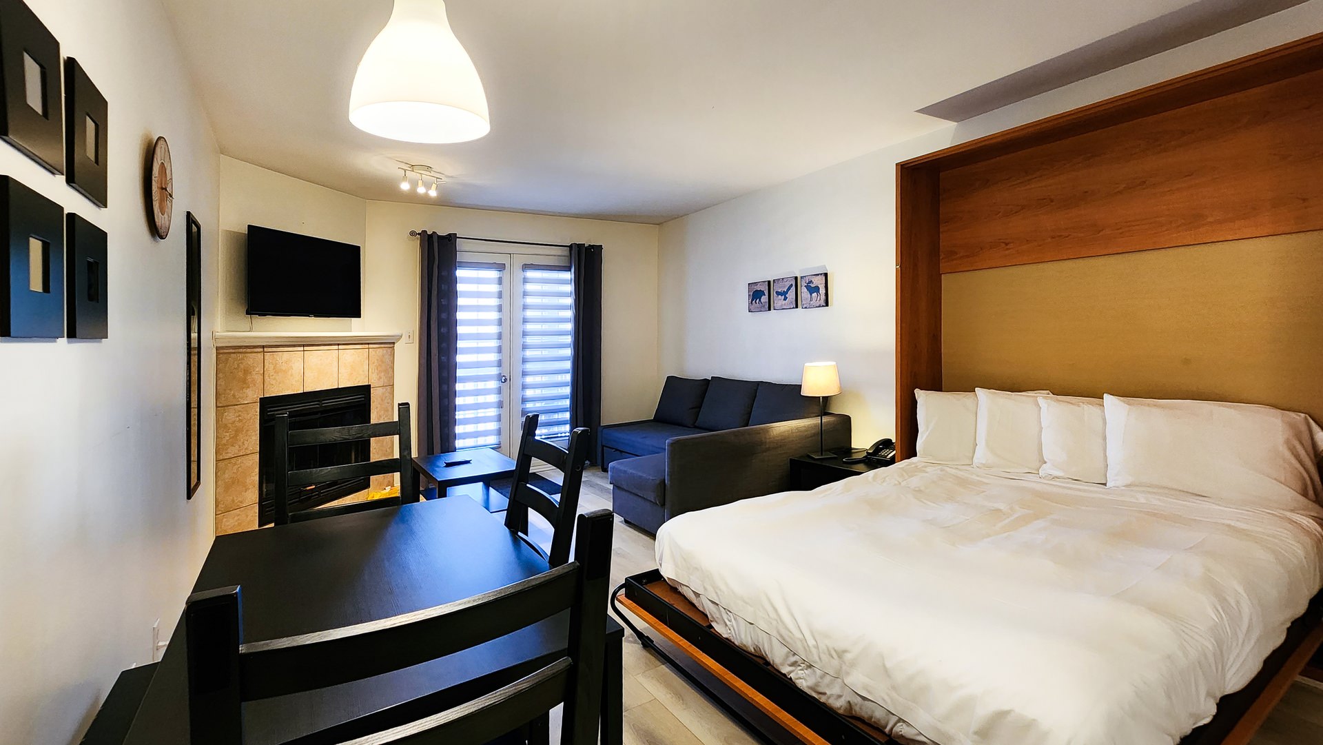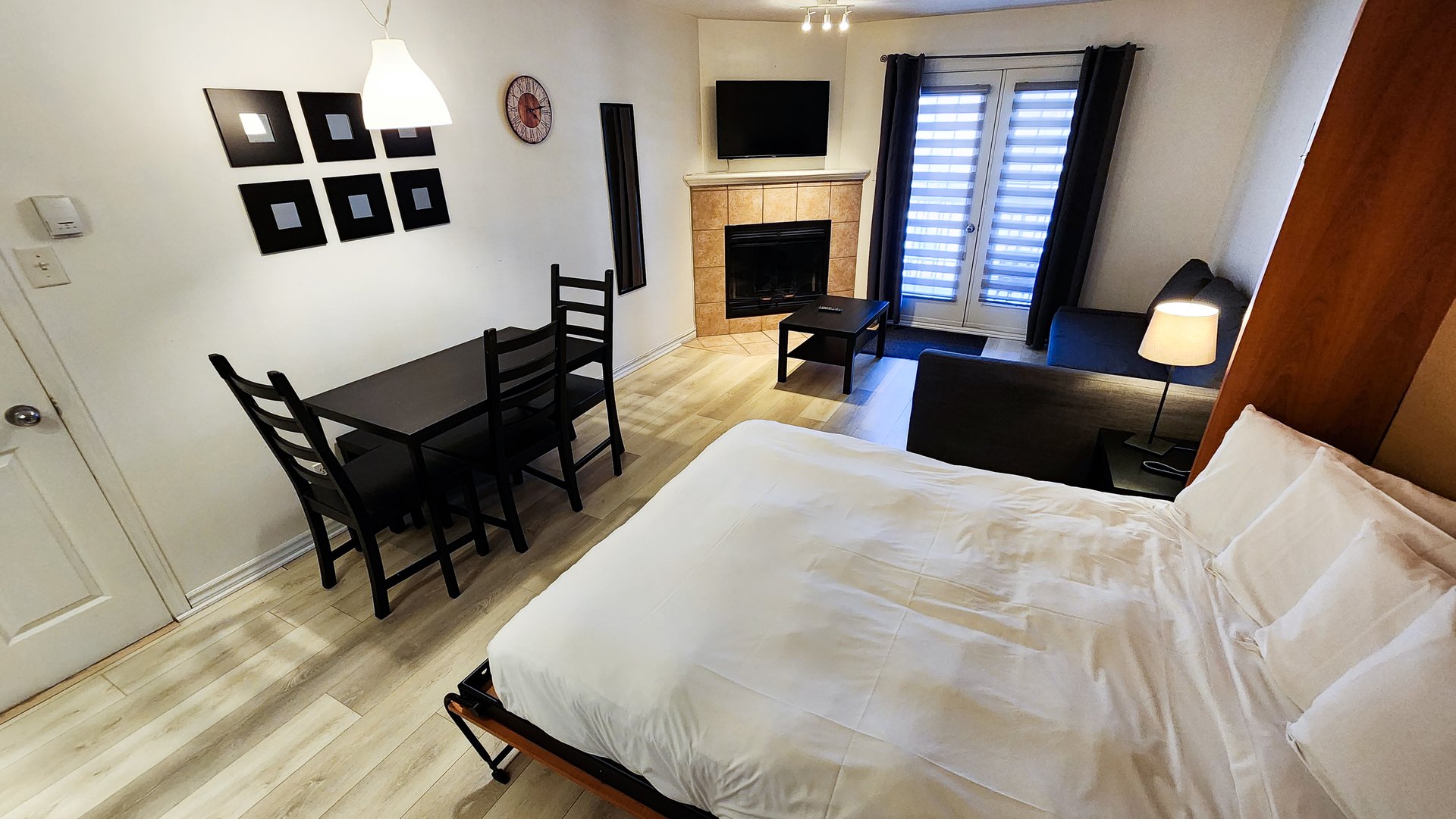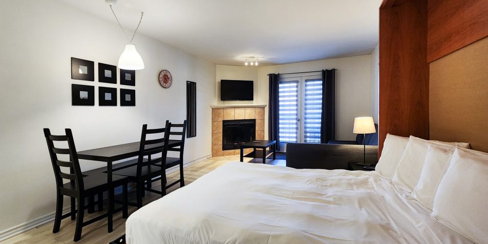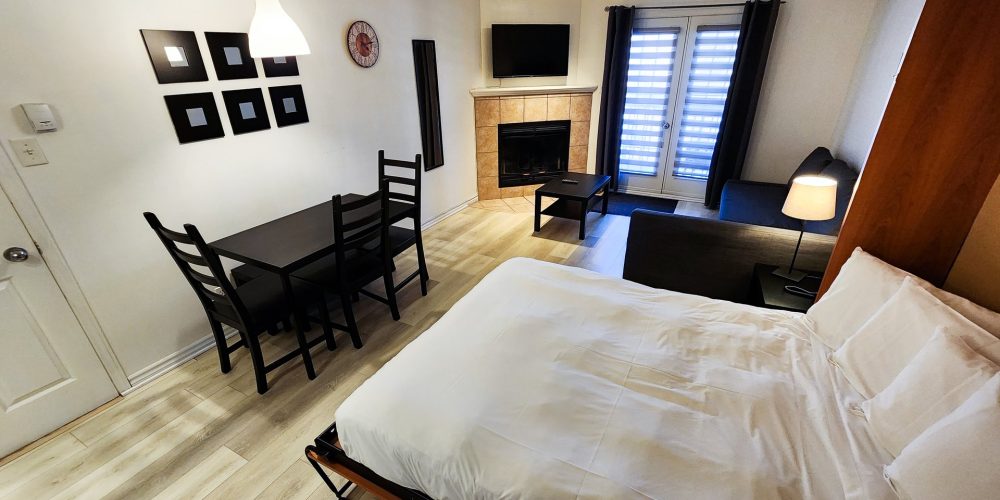 Relax in our modern, stylish, fully furnished studio with a queen-sized bed and pull-out sofa bed. Enjoy the comforts of home with access to your own dining area and kitchen, equipped with high-end stainless steel appliances. Sit back and enjoy the fireplace for complete relaxation. Additional room amenities include a Wi-Fi connection, telephone, iron/ironing board, heating, television, and more.